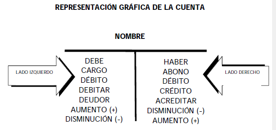 Una cuenta, en su forma más simple, es una hoja de papel dividida en dos partes lo que nos da un aspecto de T; el nombre de la cuenta debe expresar con claridad y propiedad el bien, la deuda o la operación que representa y se detalla en la parte superior T. En el lado izquierdo de la *T, se anotan todos los valores que debe la persona o cosa personificada y las cantidades que recibe o le entregan tienen el nombre de cargo, débito.