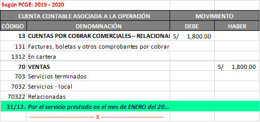 En el caso de prestación de servicios el reconocimiento de los ingresos se rige de acuerdo a lo señalado en el párrafo 20 de la NIC 18: Ingresos conforme con el cual el mismo debe reconocerse considerando el grado de terminación de la prestación a la fecha del balance, suponiendo que es probable que se perciban los beneficios. En este orden de ideas, partiendo del hecho que se sabe que al término del ejercicio se ha llevado a cabo parcialmente la prestación del servicio; no obstante haberse emitido comprobante de pago por el total, sólo se deberá reconocer como derecho (activo financiero) e ingreso la parte que corresponde al servicio prestado respecto del cual se ha ganado el derecho de cobro. Según el párrafo 21 de la NIC 18, el reconocimiento de los ingresos ordinarios por referencia al grado de terminación de una transacción se denomina habitualmente con el nombre de método del porcentaje de terminación, el cual busca que se imputen los ingresos ordinarios en los periodos contables en los cuales tiene lugar la prestación del servicio. En consecuencia, el importe pactado, consignado en el comprobante de pago deberá reconocerse en los períodos en los cuales se realice el servicio en partes iguales, ameritando en el mes de diciembre el siguiente asiento: