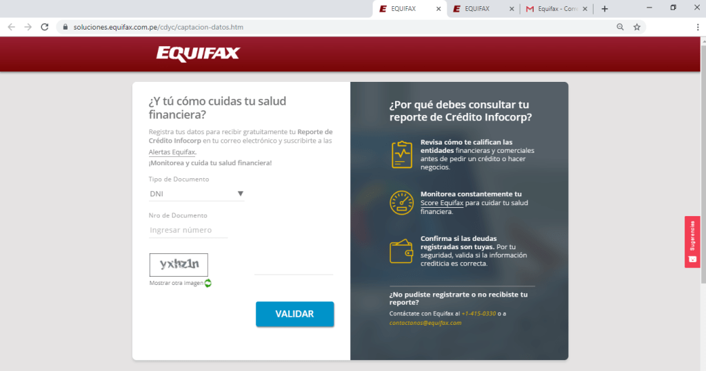El primer camino es solicitar el reporte a través de su página web. Para ello puede ingresar a la siguiente dirección: https://soluciones.equifax.com.pe/cdyc// o hacer click en este enlace.