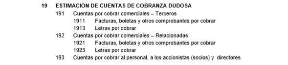 - 195 Cuentas por cobrar diversas – Relacionadas. Comprende la estimación de cobro dudoso de las cuentas por cobrar diversas a relacionadas.