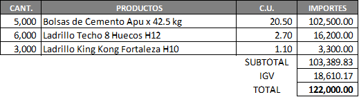 La empresa NUEVOS RETOS PERU SAC dedicada a la compra y venta de productos de materiales de construcción, el 31 de ENERO de 2020, según previa cotización MCA1 N° 0400, compra al contado mediante transferencia bancaria en cuenta del Banco de Crédito a la empresa MATERIALES DE CONSTRUCCION A1 SAC los siguientes productos: