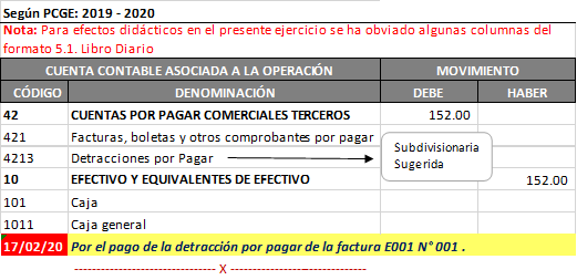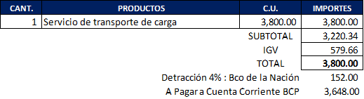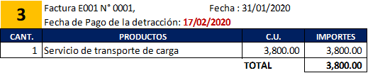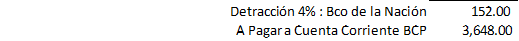 Además, la empresa NUEVOS RETOS PERU SAC realiza el deposito de detracción el 17/02/2020 por S/152.00 (4% del total de la factura E001 N° 0001) a la cuenta de detracciones del Banco de la nación a nombre de la empresa TRANSPORTES EL RAPIDO SAC por el servicio prestado y el saldo a su cuenta corriente de la empresa de transportes por el importe de S/ 3,648.00.