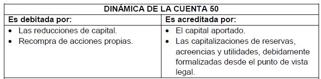En los casos de aportes acordados en una moneda distinta a la de curso legal, las diferencias cambiarias generadas entre la fecha del acuerdo y la fecha de pago del aporte, corresponden a una prima (descuento) de emisión. El capital aportado, las capitalizaciones de reservas, acreencias y utilidades, y las reducciones de capital, se reconocen en esta cuenta cuando se ha completado la forma legal, incluyendo la inscripción en el registro público correspondiente. Los acuerdos de accionistas, socios o participes sobre tales incrementos y reducciones de capital, se mantienen hasta la oportunidad de su inscripción en el registro público, en la cuenta 52.