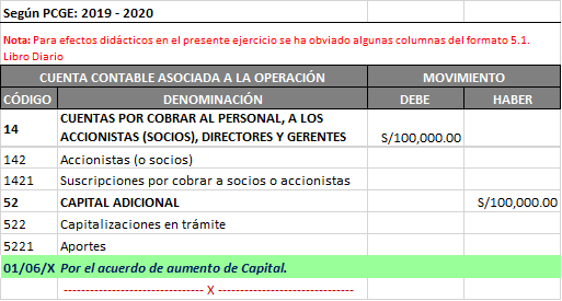 De acuerdo con la dinámica establecida por el PCGE, en tanto el acuerdo de Aumento de Capital no se formalice ante Registros Públicos, se deberá registrar dicho acto en la cuenta 52. Capital Adicional, que tiene el carácter de transitorio.