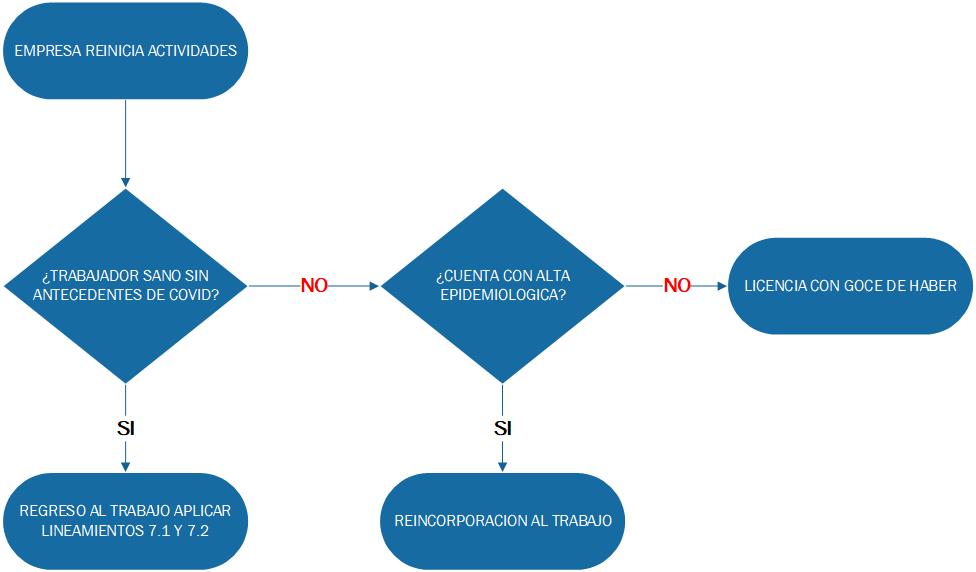 Como procedimiento se establece el proceso para el regreso al trabajo para los trabajadores que estuvieron en cuarentena y no presentaron, ni presentan, sintomatología COVID-19, ni fueron caso sospechoso o positivo de COVID-19; y que pertenecen a un centro de trabajo que no ha continuado funciones, debido a medidas de restricción emitidas por el gobierno en el marco de la emergencia sanitaria COVID-19.