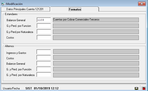 Indica que código de agrupación o donde se acumulará el movimiento de la cuenta para efectos de los Cuadros de Ganancias y Pérdidas por función. El sistema solicitará este formato para las cuentas que tienen tipo “G”. Los formatos validos están en la TABLA GENERAL 11.