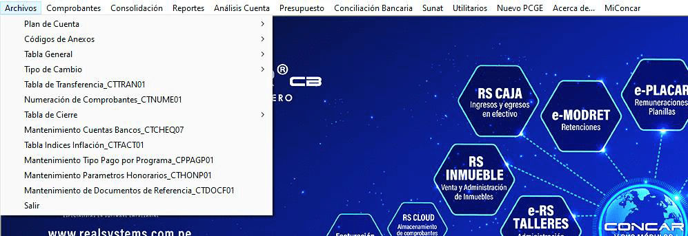 Las bases de datos principales definidas para el sistema de Contabilidad General (Menú Archivos) son las siguientes: