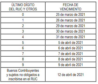 Por el ejercicio gravable 2020, los deudores tributarios presentan la Declaración y, de corresponder, efectúan el pago de regularización del Impuesto y del ITF, de acuerdo con el siguiente cronograma: