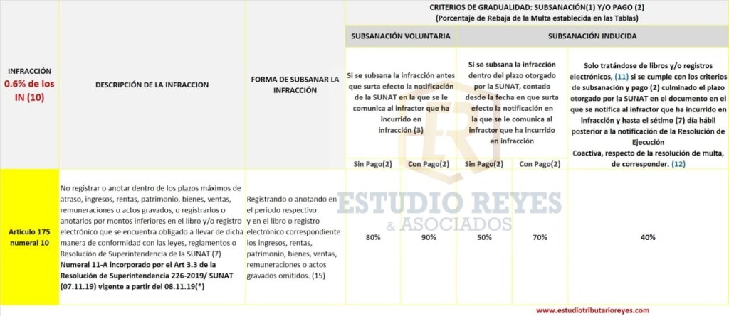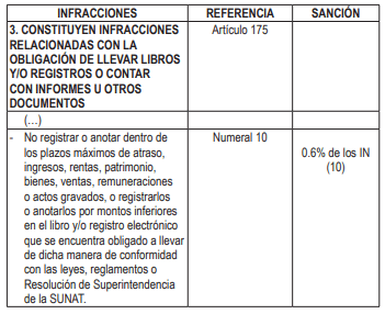 No registrar o anotar dentro de los plazos máximos de atraso, ingresos, rentas, patrimonio, bienes, ventas, remuneraciones o actos gravados, o registrarlos o anotarlos por montos inferiores en el libro y/o registro electrónico que se encuentra obligado a llevar de dicha manera de conformidad con las leyes, reglamentos o Resolución de Superintendencia de la SUNAT.