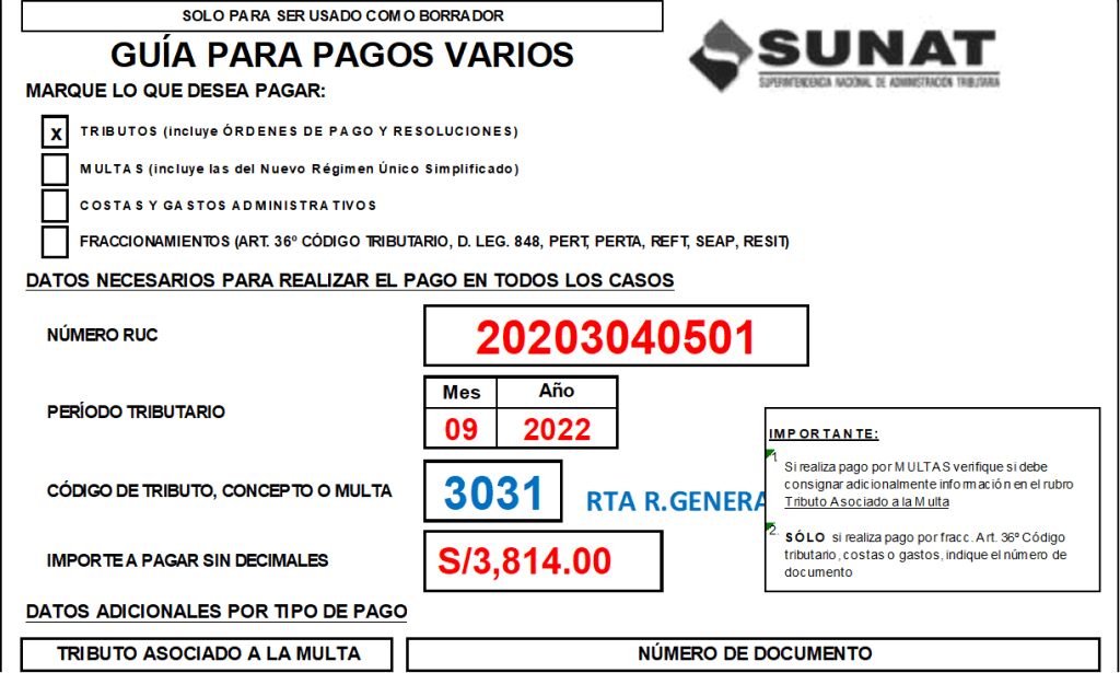 - S/ 3,814.00 de Pago a cuenta del impuesto a la Renta Reg. general según detalle de Guías de pagos varios
