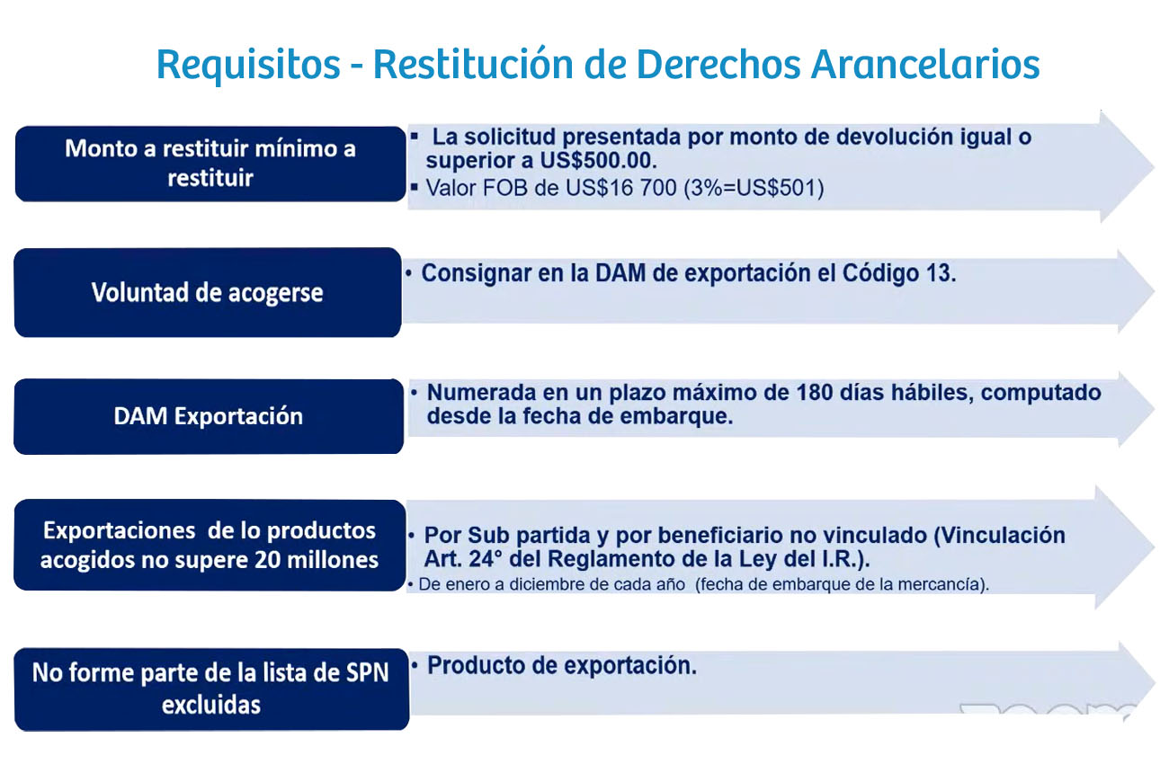 Las solicitudes de Drawback deberán ser numeradas dentro del plazo de 180 días hábiles desde la fecha del término de embarque y por montos superiores a US $500. La restitución se efectuará hasta los primeros US$ 20 millones anuales de exportación de productos por SPA y por empresa exportadora no vinculada, siempre y cuando los bienes hayan sido importados dentro de los 36 meses anteriores a la fecha de exportación.