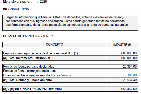 (…) A partir de la información que tiene la SUNAT por acreditaciones de dinero confrontados con sus ingresos declarados, usted podría haber generado rentas no declaradas, que formarían parte de la renta imponible del impuesto a la renta de personas naturales.