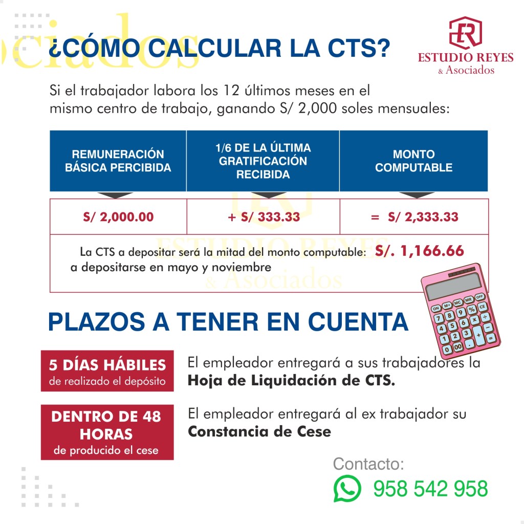 Para calcular la Compensación por el tiempo de servicios – CTS debes considerar la Remuneración computable (RC) sueldo básico que recibe el trabajador. Además, tener presente para el cálculo lo siguiente: