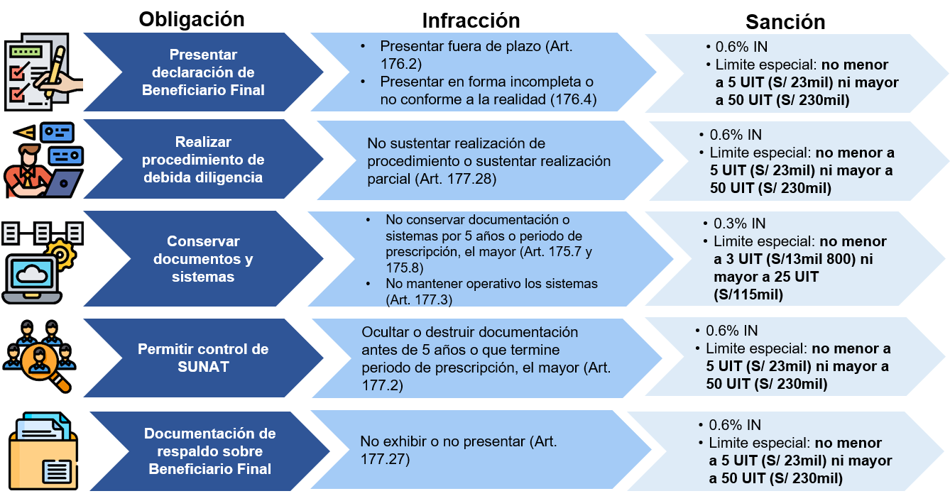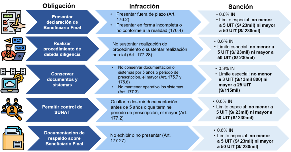 De no cumplirse con las obligaciones vinculadas a la declaración jurada informativa de Beneficiario Final, el procedimiento de debida diligencia, la conservación de la documentación de respaldo y sistemas y permitir el control por parte de la SUNAT, el sujeto obligado incurrirá en las infracciones detalladas en el siguiente cuadro: