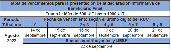 - La declaración jurada informativa de Beneficiario Final correspondiente al Tramo II (personas jurídicas que declararon ingresos netos de más de 500 UIT hasta 1000 UIT respecto del ejercicio 2021), en el mes de setiembre, tomando como fechas de vencimiento la correspondiente al periodo tributario agosto de 2022 (*).
