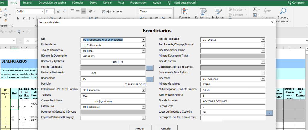 - Cuando el sujeto obligado declare al beneficiario final que ostenta la propiedad o el control a través de una cadena de titularidad o cadena de control, se debe adjuntar al citado formulario el archivo Excel «Datos de la cadena de titularidad y/o cadena de control» en el cual se debe detallar la información relativa a la cadena de titularidad y/o de control, según corresponda. El tamaño del citado archivo no debe ser superior a dos (2) megabytes (Mb).