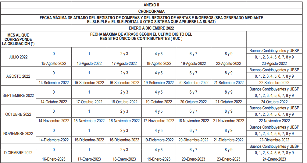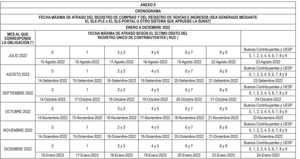 NOTAS:- En cada casilla se indica: en la parte superior, el último dígito del número de RUC y, en la parte inferior, el día calendario correspondiente al vencimiento.- Buenos Contribuyentes: De conformidad con lo dispuesto en el inciso a) de la Única Disposición Transitoria del Decreto Legislativo N° 1535, los sujetos incluidos en el Régimen de Buenos Contribuyentes a que se refiere el Decreto Legislativo N° 912 al día anterior a la fecha de entrada en vigencia del Decreto Legislativo N° 1535, continuarán aplicando las normas que otorgan un tratamiento específico por su calidad de tales, hasta que surta efecto la primera asignación del perfil de cumplimiento de acuerdo con el aludido decreto legislativo.- UESP: Unidades Ejecutoras del Sector Público Nacional.