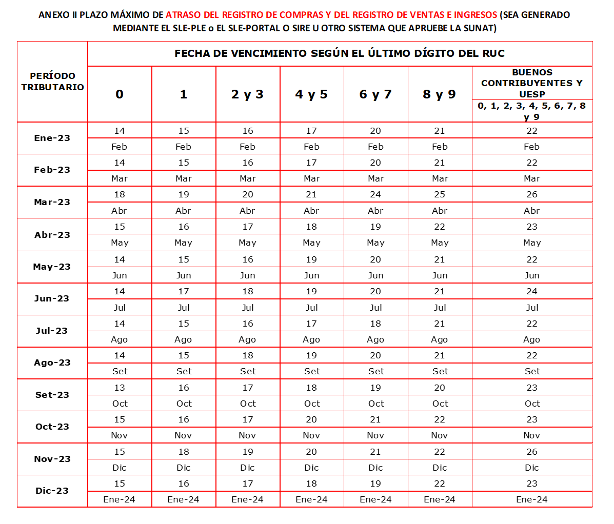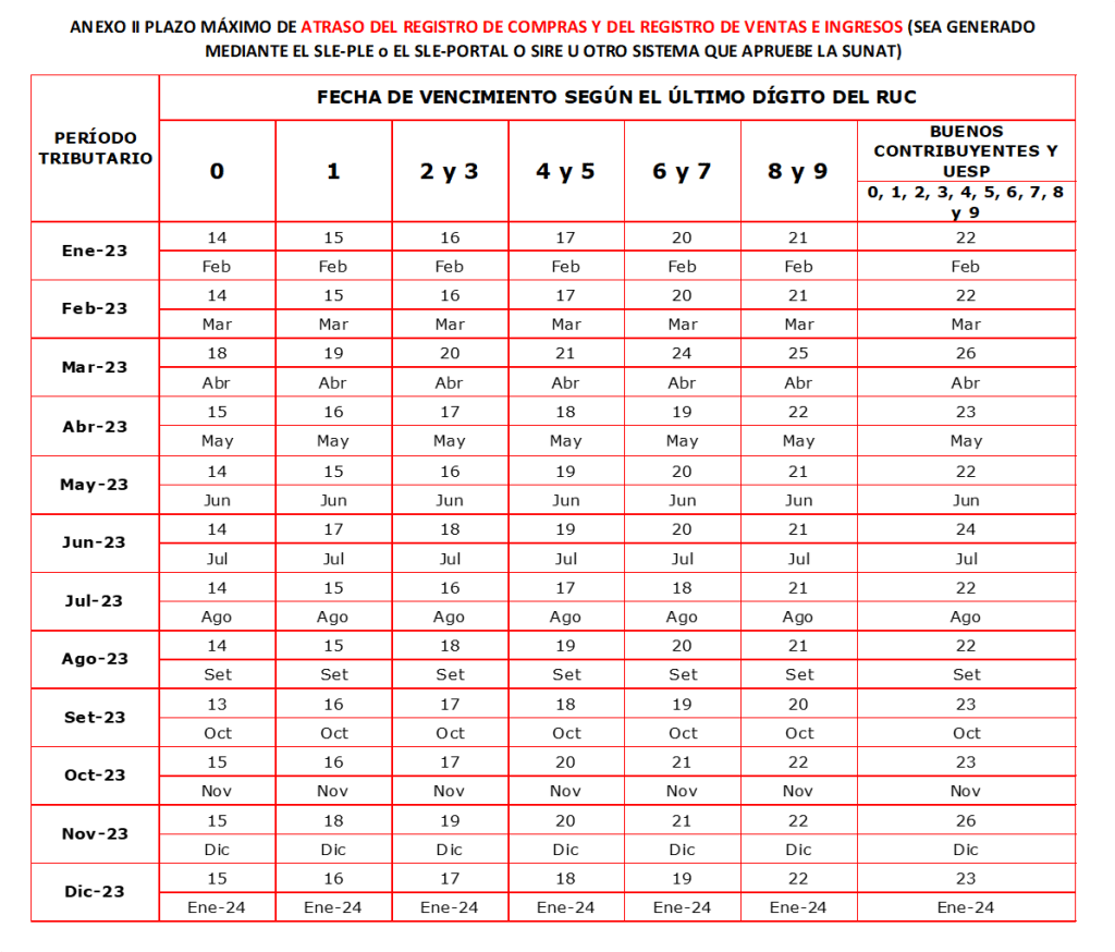ANEXO II PLAZO MÁXIMO DE ATRASO DEL REGISTRO DE COMPRAS Y DEL REGISTRO DE VENTAS E INGRESOS (SEA GENERADO MEDIANTE EL SLE-PLE o EL SLE-PORTAL O SIRE U OTRO SISTEMA QUE APRUEBE LA SUNAT)