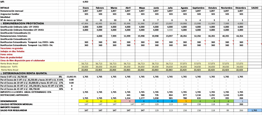 Para esto la remuneración mensual (incluidos los conceptos remunerativos ordinarios) se multiplica por el número de meses que falta para terminar el ejercicio gravable, incluido el mes al que corresponda la retención.
