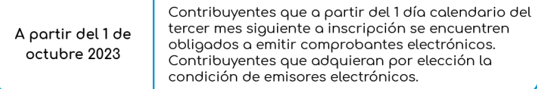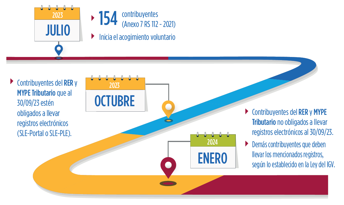 - En los períodos julio, agosto, setiembre, octubre, noviembre o diciembre de 2023, según corresponda, los contribuyentes que, de conformidad con el artículo 4 de la Resolución de Superintendencia No. 286-2009/SUNAT y el artículo 2 de la Resolución de Superintendencia No. 379-2013/SUNAT, adquieran en esos períodos la obligación de llevar sus registros en el Sistema de Libros Electrónico.