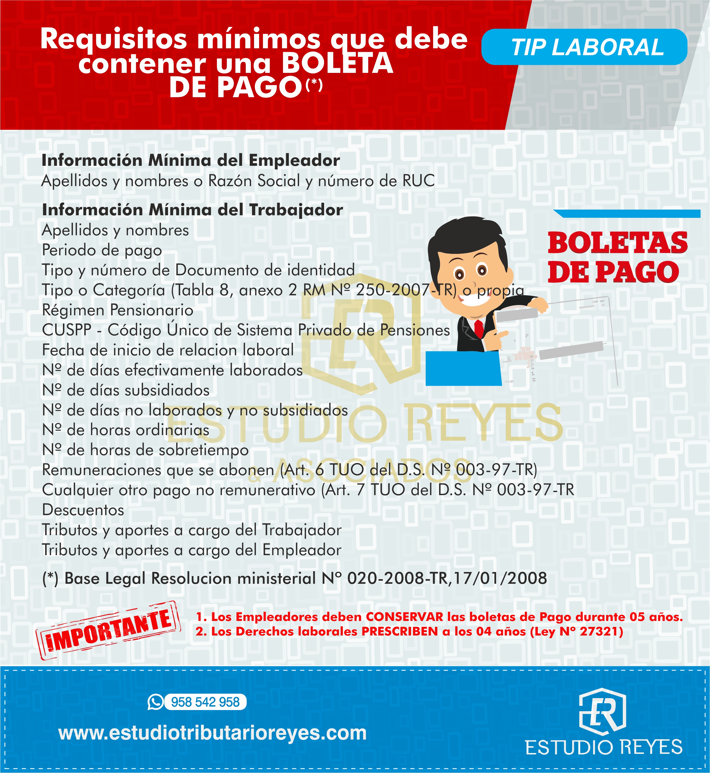 - El incumplimiento de las obligaciones sobre boletas de pago de remuneraciones, hojas de pago de liquidación de la CTS; así como, aquellas entregadas al cese, de acuerdo con las formalidades y contenidos exigidos por las normas sobre la materia, siempre que no esté tipificado como infracción grave. Por ejemplo los requisitos mínimos de debe contener una boleta de pago son: