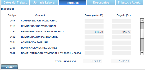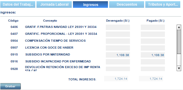 | Código | Conceptos | Ingresos S/. | Descuentos S/. | Neto S/. |