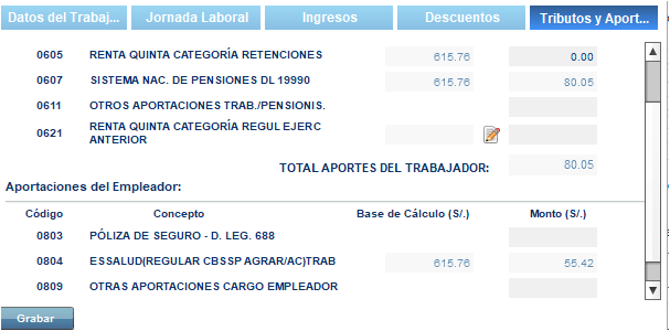 | 0121 | REMUNERACIÓN O JORNAL BÁSICO (10 DIAS) | 615.76 | 80.05 | 535.71 |