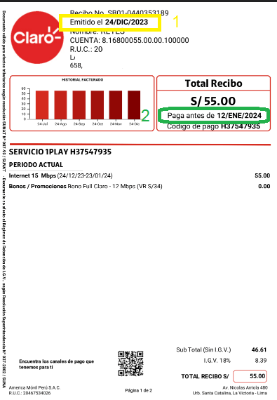 Veamos un ejemplo de un recibo de servicio público y su anotación en el registro de compras