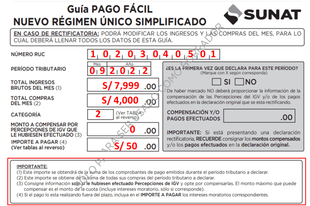 La declaración y pago del impuestos de realiza mediante el Formulario Nº 1611 «Guía de pago fácil- NRUS» en una sola ocasión, no existe otro formulario ni declaración mensual, para la ejecución del pago la persona natural con negocio o un tercero debe acercarse al banco mas cercano a realizar el pago