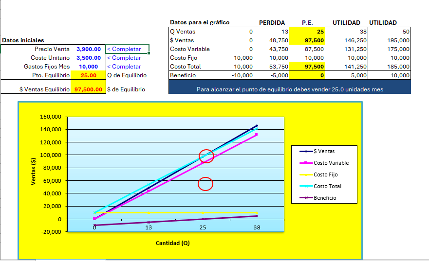 Para este caso el Punto de Equilibrio del negocio es de 25 en unidades y en Soles es S/. 97,500. por otro lado vendiendo 25 motocicletas tenemos una ganancia de S/10,000.00 (S/ 400.00 x 25) que sirve para cubrir el gasto fijo total del mes.