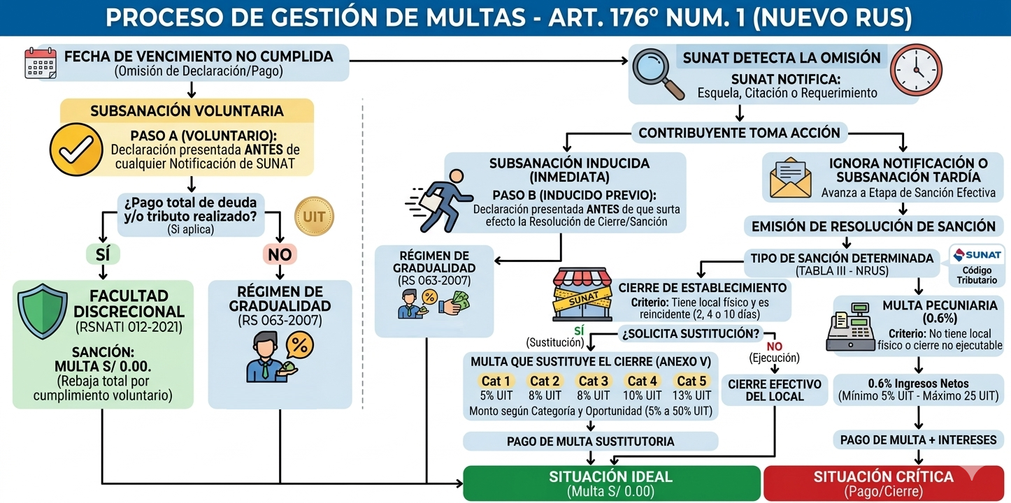 | Artículo 176 numeral 1: No presentar las declaraciones que contengan la determinación de la deuda tributaria, dentro de los plazos establecidos | Antes de que surta efecto la notificación de la Resolución de Cierre: Si el sujeto que se encuentra en el Nuevo Régimen Único Simplificado subsana la infracción en forma voluntaria antes que surta efecto la notificación de la resolución de cierre, no se aplicará la sanción de cierre ni de multa. La discrecionalidad aplica inclusive cuando al referido sujeto se le hubiere notificado el documento mediante el cual se le comunica que está incurso en infracción, siempre que la subsane antes que surta efecto la notificación de la resolución de cierre. |
