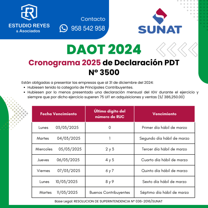 SUNAT: Cronograma de vencimiento de PDT 3500 – DAOT 2024 (Marzo 2025)