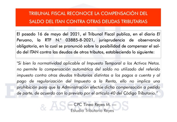 El pasado 16 de mayo del 2021, el Tribunal Fiscal publica, en el diario El Peruano, la RTF N.° 03885-8-2021, jurisprudencia de observancia obligatoria, en la cual se pronunció sobre la posibilidad de compensar el saldo del ITAN contra las deudas de otros tributos, estableciendo lo siguiente: "Si bien la normatividad aplicable al Impuesto Temporal … Sigue leyendo Tribunal Fiscal reconoce la compensación del saldo del ITAN contra otras deudas tributarias