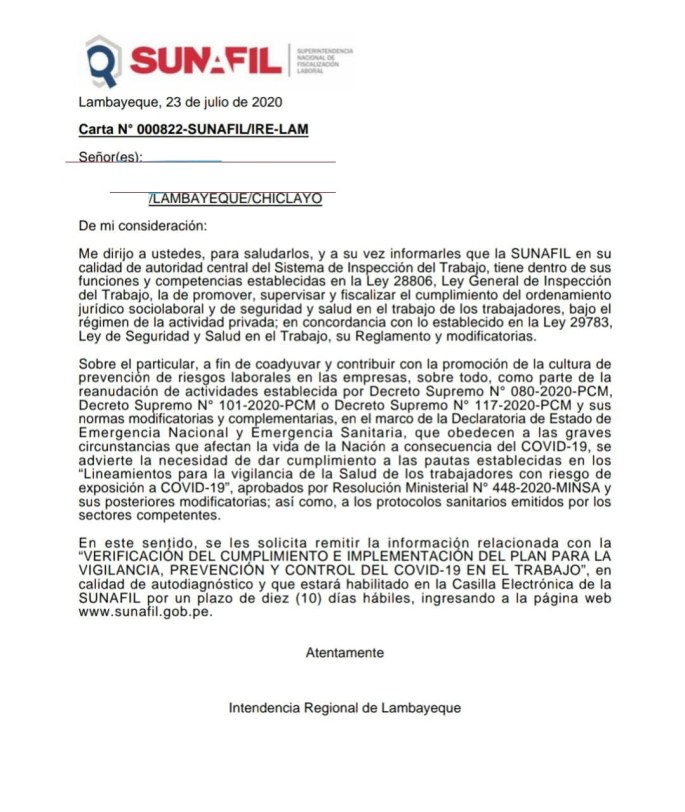 SUNAFIL ENVÍARÁ CUESTIONARIO A MÁS DE 39 MIL EMPRESAS PARA QUE BRINDEN INFORMACIÓN SOBRE CUMPLIMIENTO DEL PLAN PARA LA VIGILANCIA Y PREVENCIÓN DEL COVID-19