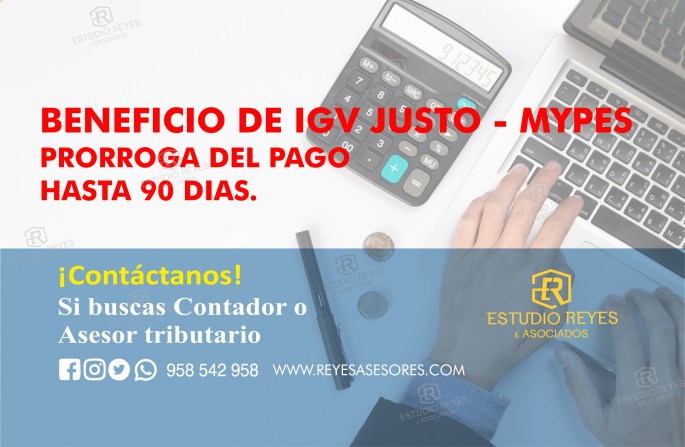 La Ley tiene como objeto establecer la prรณrroga del pago del impuesto general a las ventas (IGV) mensual que corresponda a empresas que tengan la condiciรณn de micro (150 UIT) y pequeรฑas empresas con ventas anuales hasta 1700 UIT. Que vendan bienes, presten servicios y/o ejecuten contratos de construcciรณnMicro y pequeรฑas empresas cuyas ventas anuales … Sigue leyendo Beneficio para Mypes del pago de IGV a 90 dรญas – IGV JUSTO.