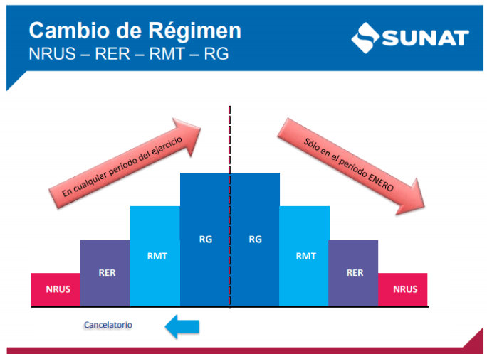 Enero mes de cambios ¿Cómo cambio el Régimen tributario de mi empresa? La imagen explica el cambio de règimen parecido a una "escalera" esto significa que mientras mas bajo sea la carga tributaria el cambio a un règimen mayor será en cualquier mes del año solo con la declaración y pago del impuesto, sin embargo … Sigue leyendo Cambio de Régimen tributario ; NRUS, RER, RTM, RG? ✔️ SUNAT – 2024