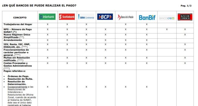 Bancos que reciben Pago Fácil Entidades bancarias que reciben pagos de transacciones Pago Fácil(haga click en enlace) Para consultar la ubicación de las oficinas del banco de su preferencia deben dar clic en su logo. https://orientacion.sunat.gob.pe/images/stories/declaracionypago/Bancospuederealizarelpago012019.pdf Pago Fácil es aplicable en los siguientes tributos y conceptos: · Nuevo Régimen Único Simplificado (NRUS): Todas las categorías · Renta de 1º Categoría – … Sigue leyendo SUNAT | ¿EN QUÉ BANCOS SE PUEDE REALIZAR EL PAGO?